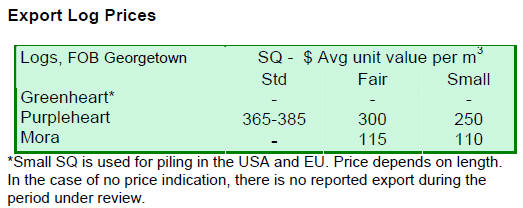 There were no exports of greenheart logs in the period reviewed and this is a full 4 weeks without export of greenheart. However, purpleheart logs were exported at good prices for all qualities.