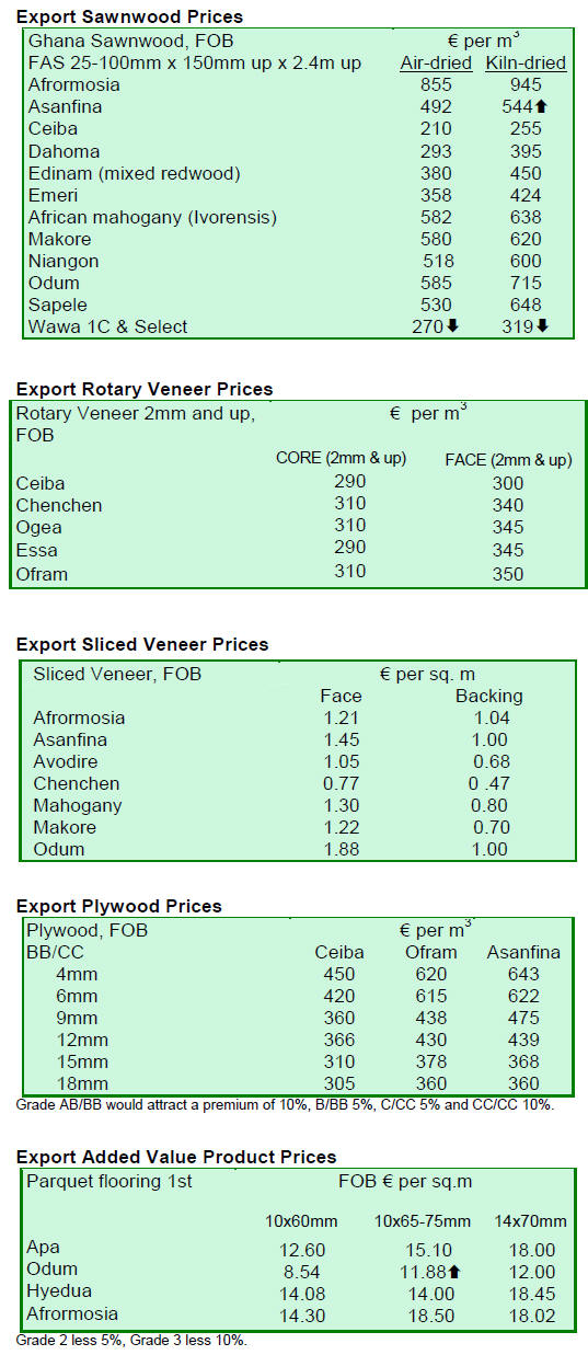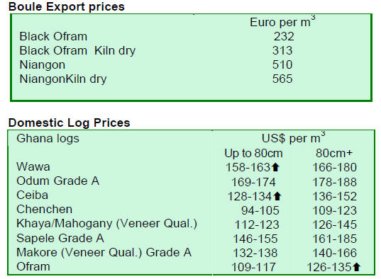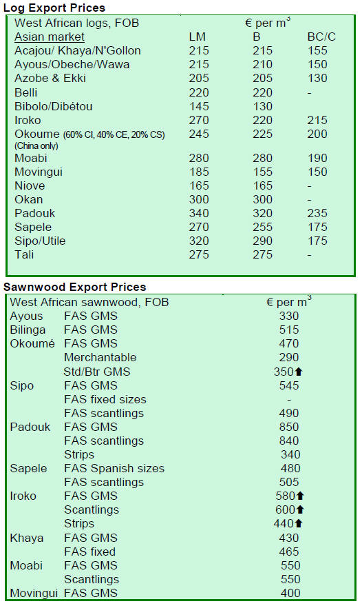 Iroko sawnwood is in high demand and export prices have moved higher over the past weeks. Prices of some individual species have been moving higher, for example doussie sawnwood export prices increased significantly and doussie GMS prices are up around euro 50 ¨C 70 per cubic metre reflecting firm demand and limited supply.