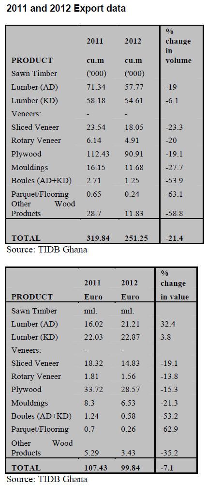 According to data from the Timber Inspection Development Division (TIDD) of the Forestry Commission (FC), the total volume of wood products export for the period January to December 2012 was 251,346 cubic metres.