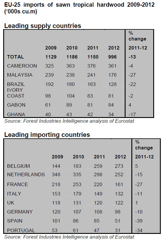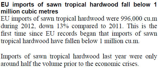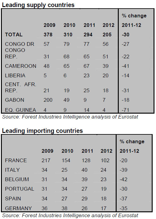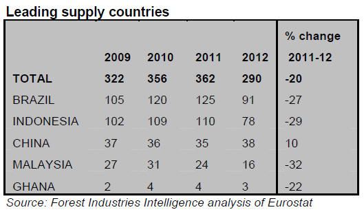 EU imports of tropical hardwood logs in 2012 were only 205,000cu.m, 30% down on the previous year and less than a quarter of the volume prevailing prior to the economic crises.