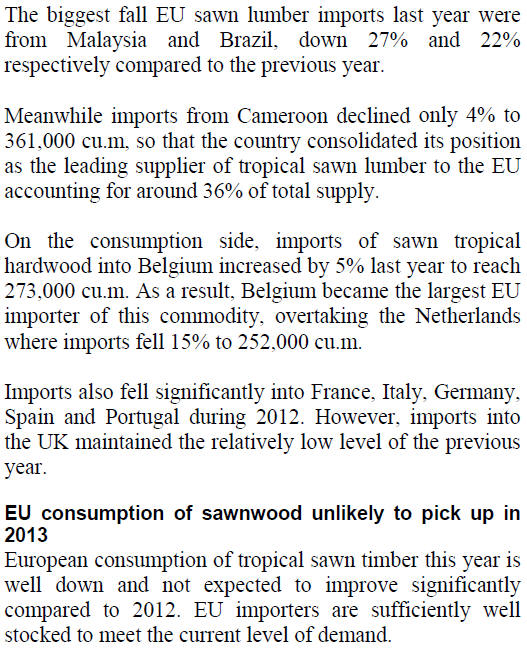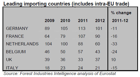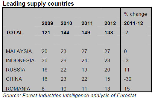 Demand in Europe is also constrained because some importers built stocks in advance of implementation of the EU Timber Regulation (EUTR) from 3 March 2013.