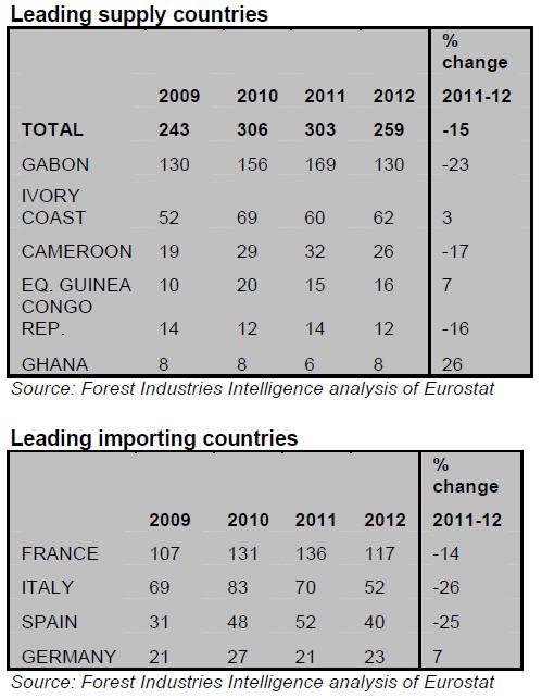 EU imports of tropical hardwood veneer were 259,000 cu.m in 2012, 15% down on the previous year. A large proportion of European tropical veneer imports consist of rotary veneer from Gabon destined for French plywood mills.