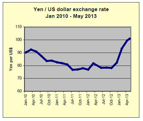 On foreign exchange markets the yen fell to a four year low against the US dollar on May 9. An exchange rate of 101 yen to the dollar marked a turning point for the yen as the government’s stimulus measures and the Bank of Japan’s efforts to expand liquidity start to have a greater impact.