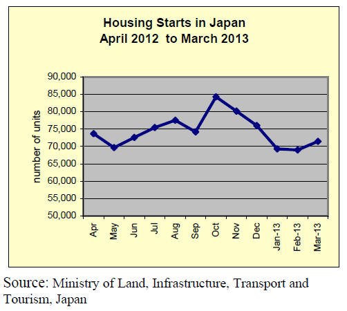 This seems to be temporary drop and the Ministry of Land, Infrastructure and Transport commented housing market continues gradual recovery. In March starts, owners’ units showed 11.4% more and rental units 10.7% more. Owners’ units increased in populated regions like Tokyo and Nagoya then starts in three quake stricken prefectures of Iwate, Miyagi and Fukushima were considerably high.