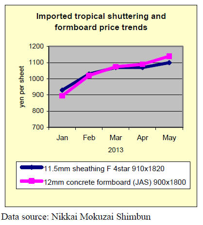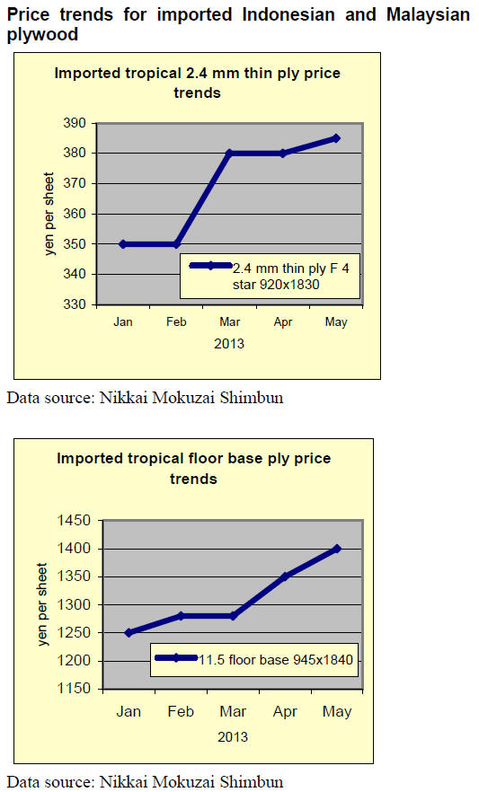 In Tokyo market, the prices of 3x6 JAS concrete forming panel are 1,100 yen per sheet delivered, 20 yen up from April. 12 mm structural panel are 1,150 yen, 50 yen up. JAS 3x6 coated concrete forming panel are1,200 yen, 20 yen up.