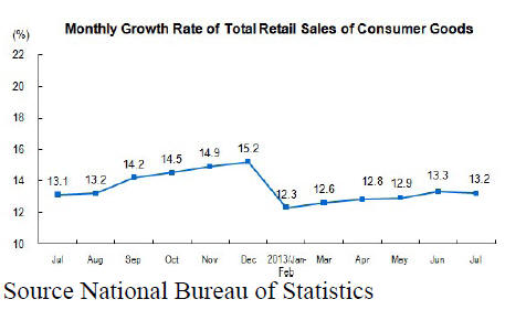 In July total consumer goods retail sales reached yuan 1,851 billion up