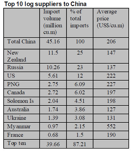 China¡®s log imports totalled 45.16 million cu.m valued at