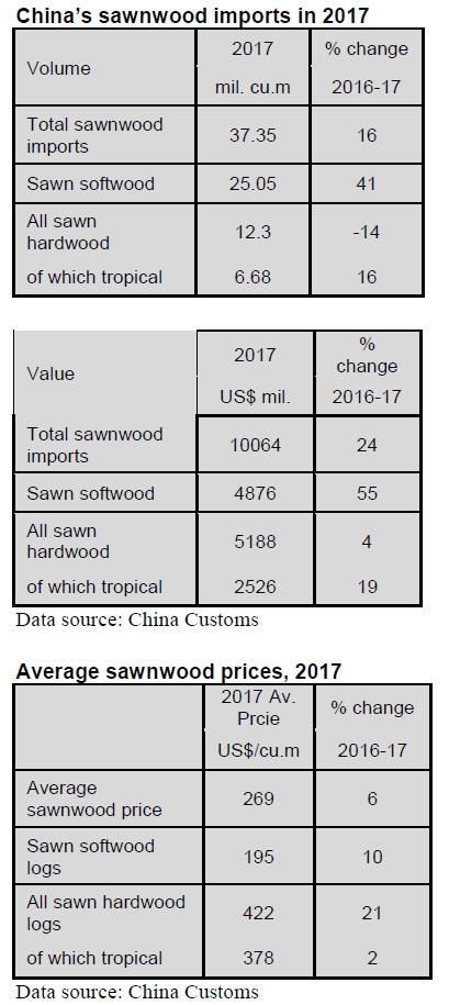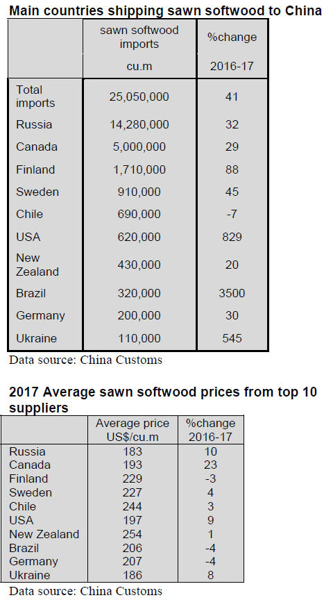 China¡¯s 2017 sawn softwood imports surged 41% to 25.05