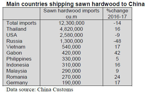 Sawn hardwood imports fell 14% to 12.30 million cubic