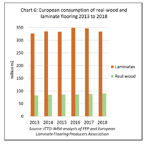 This shows that even the laminates industry may be losing share in the EU to a range of non-wood flooring products such as luxury vinyl tiles, porcelain tiles, and products made of recycled materials and other renewables like bamboo and cork.