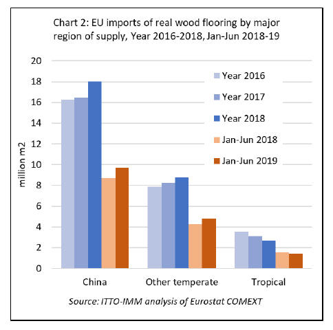 Total imports of real-wood flooring into the EU increased 6.2% to 29.52 million sq.m in 2018. Tropical countries accounted for only 9.2% of total imports in 2018, down from 11.1% the previous year and close to 50% before the financial crises.