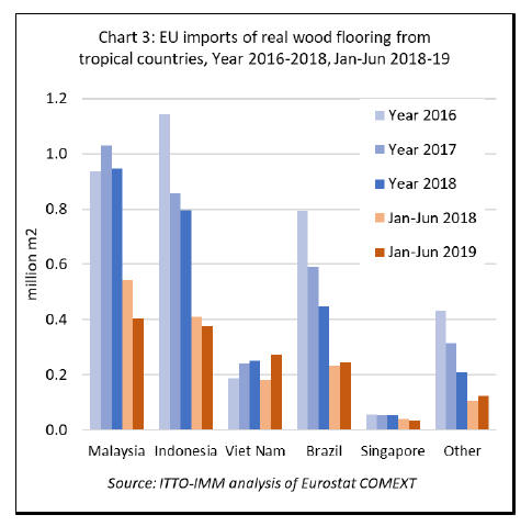 EU imports of real-wood flooring from tropical countries fell by 12% in 2018 to 2.70 million sq.m and were down by 4%, to 1.46 million sq.m, in the first six months of 2019. Imports from Malaysia were down 8% to 950,000 sq.m in 2018 and fell 25% to 400,000 sq.m in the first half of 2019.