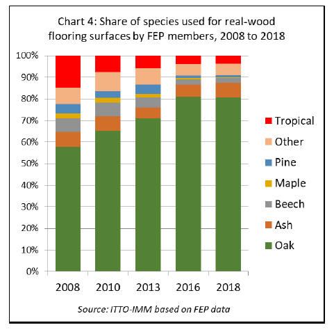 The share of oak surfaces in European real-wood flooring production was 80.7% in 2018, up from 71% five years earlier and 58% in 2008. During the same period, the share of tropical timber fell from 15% to less than 4% (Chart 4).