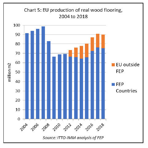 One indicator of this competition is provided by FEP data which shows that, after reaching a decadal high in 2017, real-wood production in FEP countries fell 1.3% to 75.3 million sq.m in 2018 (Chart 5). Total real-wood flooring consumption in FEP countries also fell in 2018, by 2.3% to 79.9 million sq.m.