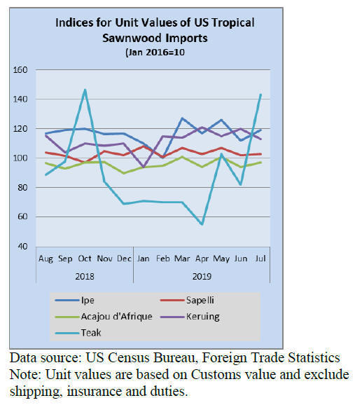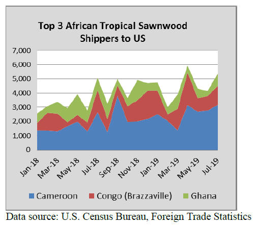 US imports of sawn tropical hardwood rebounded in July from a