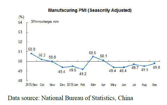 China¡¯s official manufacturing Purchasing Managers¡¯ Index inched up in September to 49.8 according to the National Bureau of Statistics from 49.5 in August.