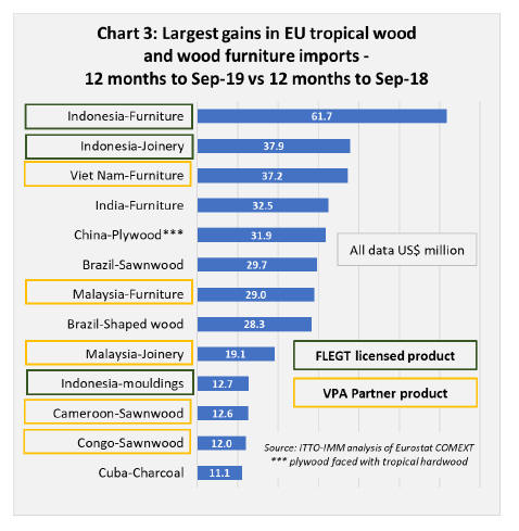 the largest gains in EU tropical wood product imports in the year to