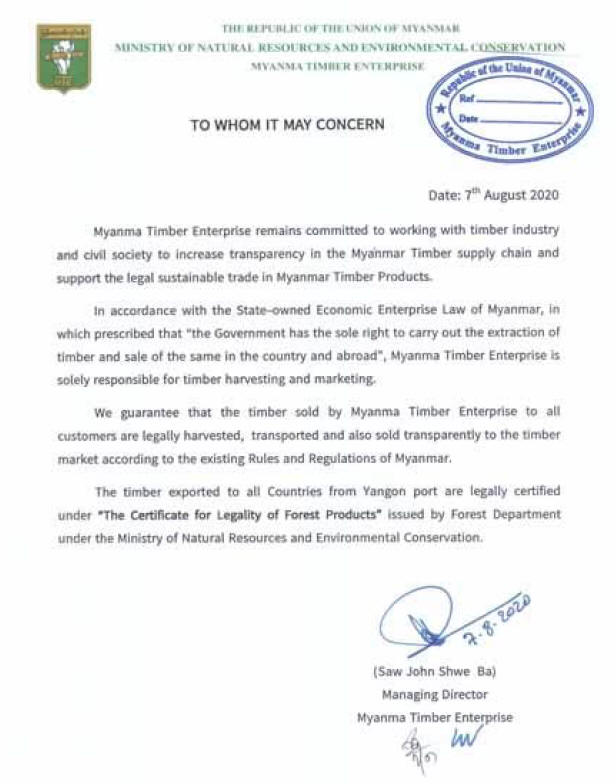 The Myanma Timber Enterprise (MTE) has issued a letter