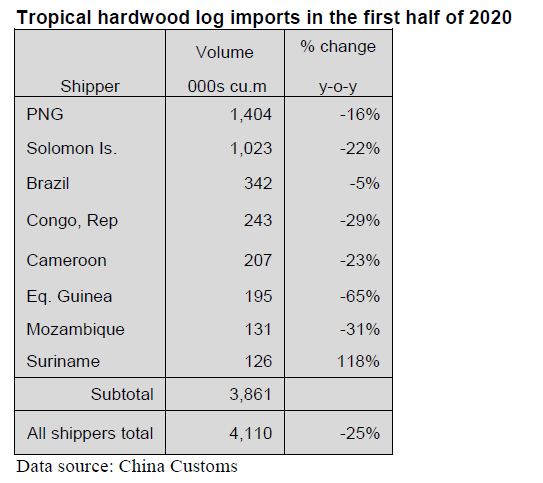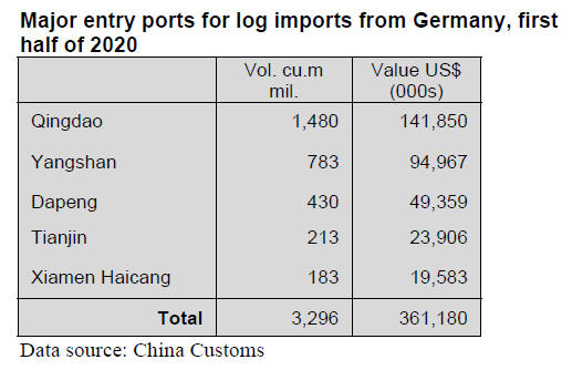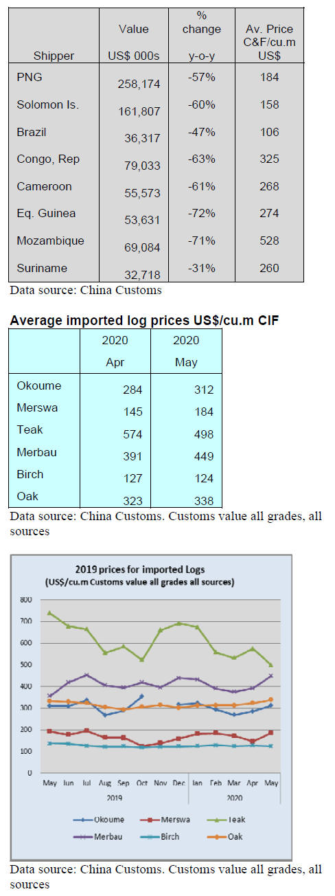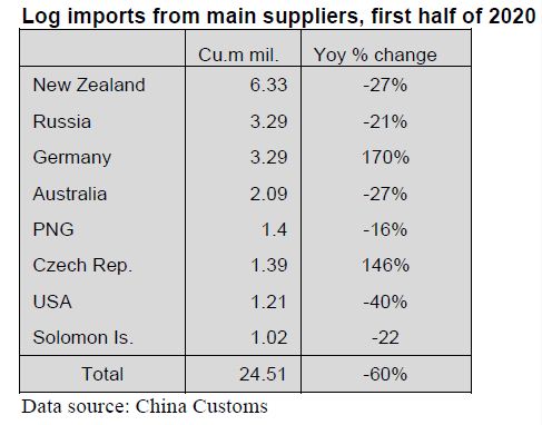 China¡¯s log imports fell sharply in the first half of 2020 to