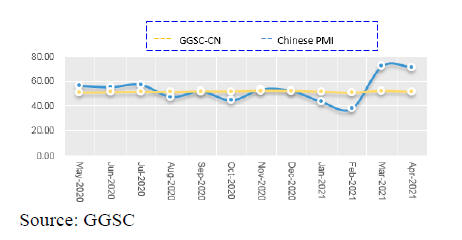 In April 2021 China's PMI index rose to 51.1%, a decline
