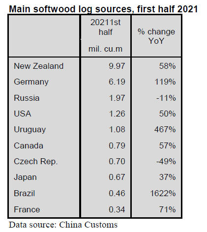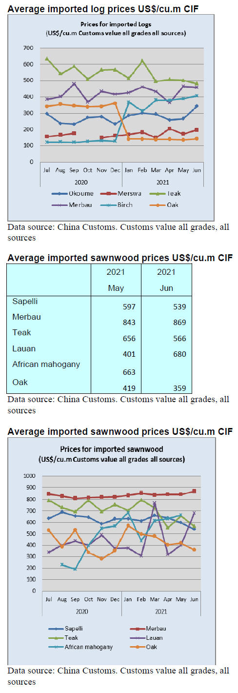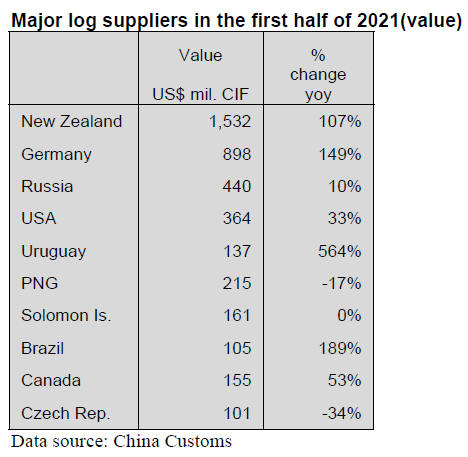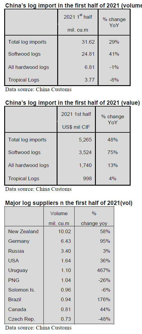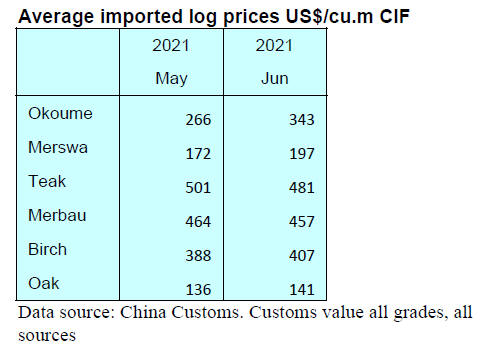 logs in the first half of 2021 was US$256 (CIF) per cubic