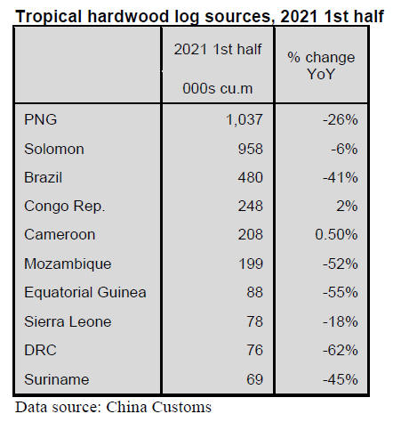 China¡¯s hardwood log imports in the first half of 2021 fell