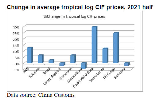 First half 2021 CIF prices for most of China¡¯s tropical log