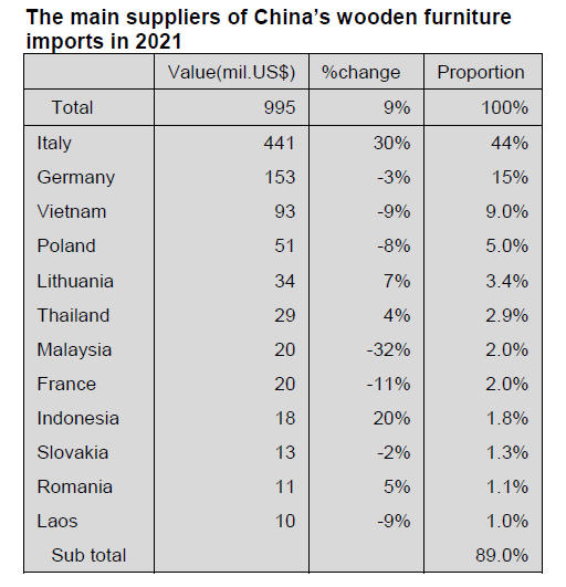 furniture imports rose 9% to US$995 million in 2021. Italy