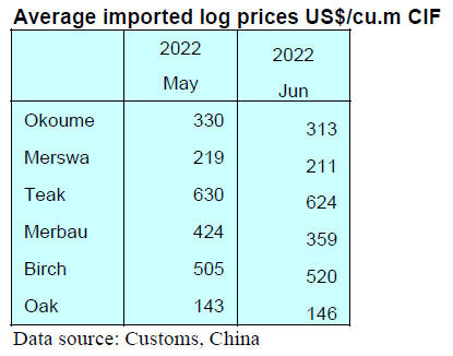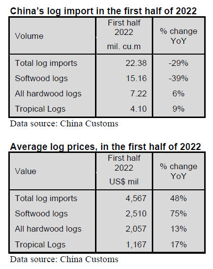 logs in the first half of 2022 was US$285 (CIF) per cubic