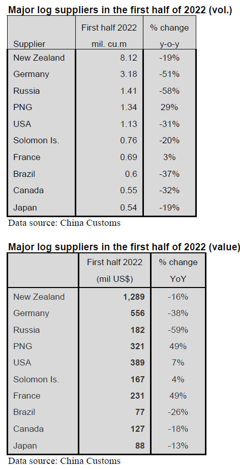 China¡¯s log imports in the first half of 2022 totalled 22.38