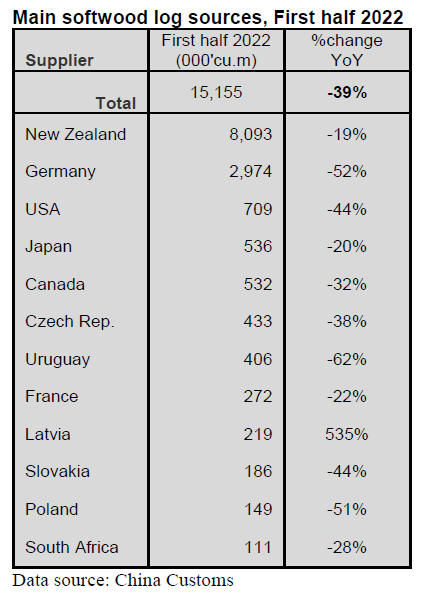 Imports of softwood logs from almost all of China's major