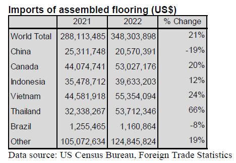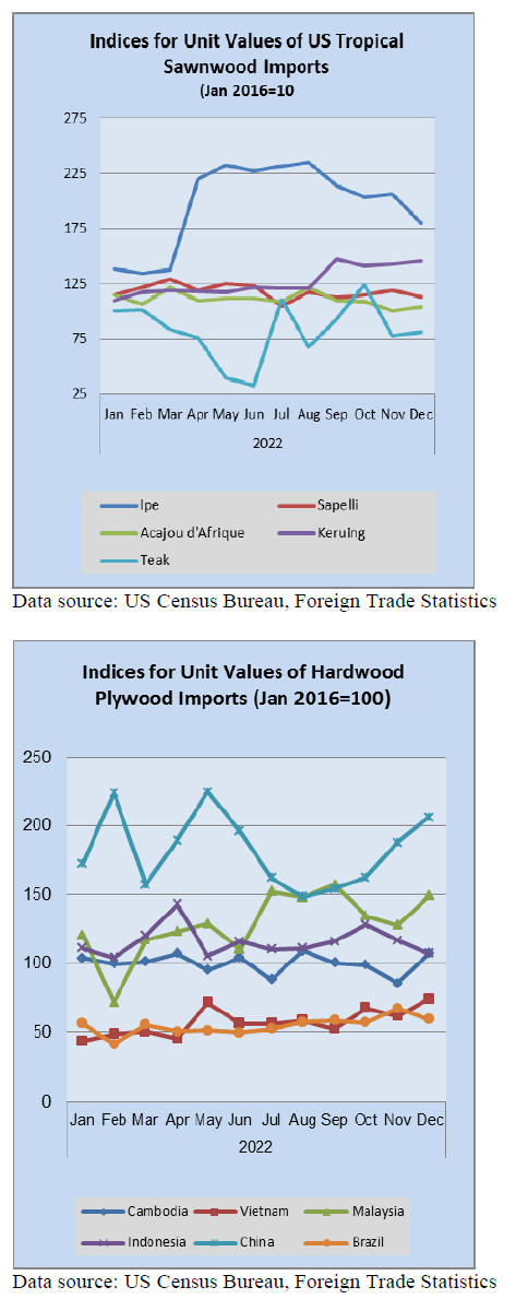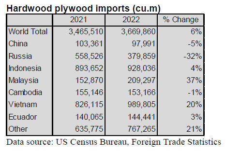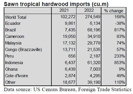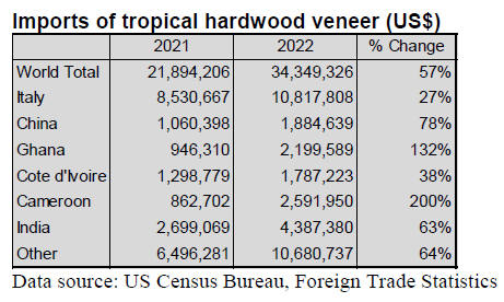 U.S. imports of tropical hardwood veneer grew by 57% in