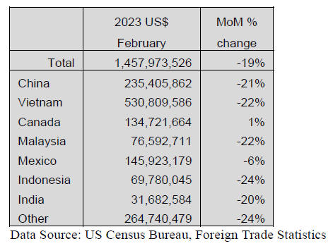Brazil fell 41% and imports from Malaysia fell 37%.