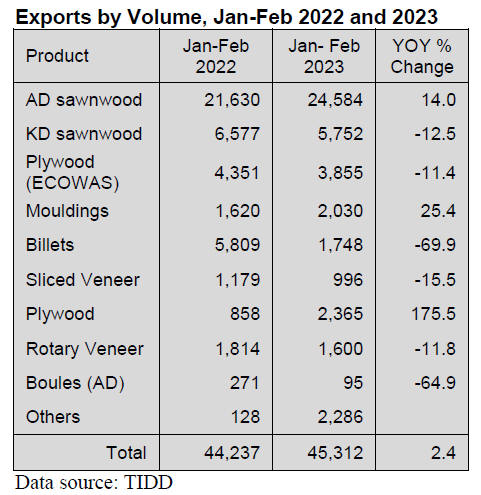 Plywood is one of Ghana’s wood product exports and much of this is trucked to ECOWAS regional markets. The total volume of plywood exports in the first two months of this year was 2,365 cu.m, a recorded 175% increase over the same period in 2022.