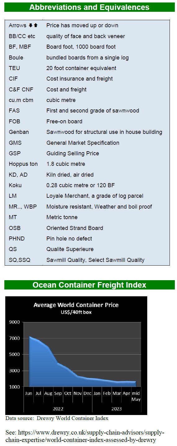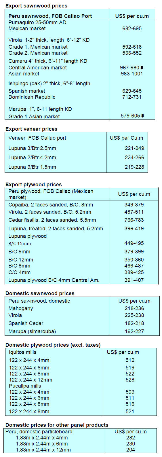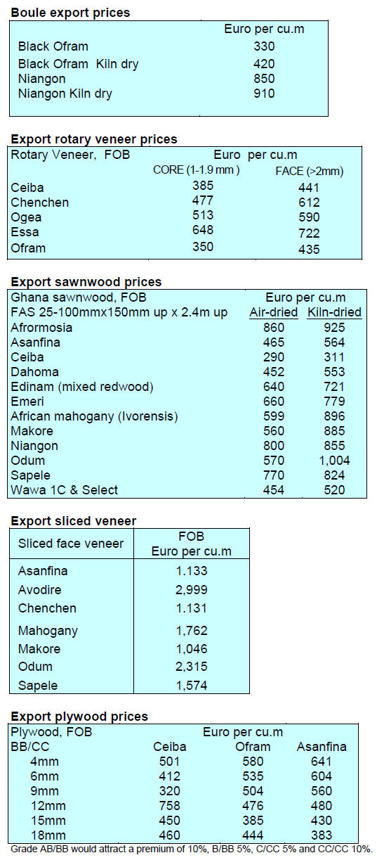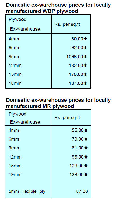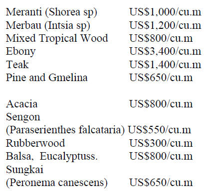For veneer raw material from plantation forests and processed wood products from mixed forest prices have been lowered by US$50/cu.m from the previous month. However, veneer products from plantation logs for wooden sheets for packing boxes have increased.