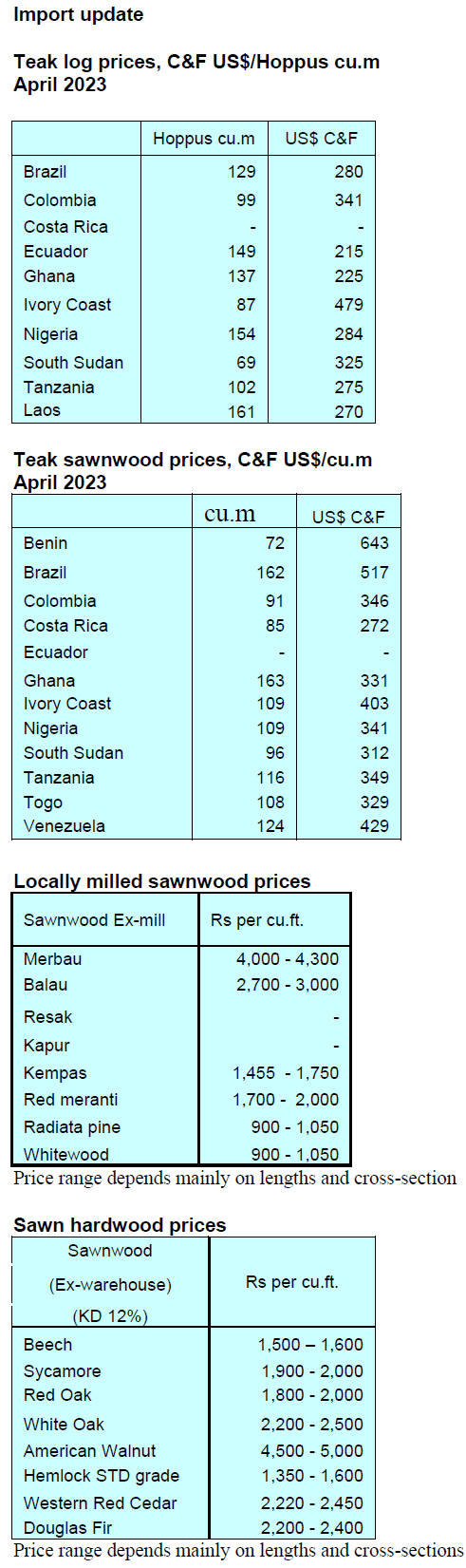 In the first 3 months of 2023 imports of sawn padouk totalled 32,500 cu.m, worth US$11.8 million, down 8% in volume and 23% in value over the same period in 2022.