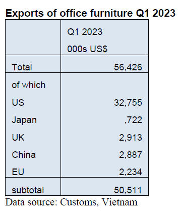 In addition, in the first 3 months of 2023 other office furniture export items included desks, bookshelves, chairs, study desks and computer desks. Notably, exports of office chairs recorded a high growth in the first 3 months of 2023, reaching US$1.6 million, up over 200% over the same period in 2022.