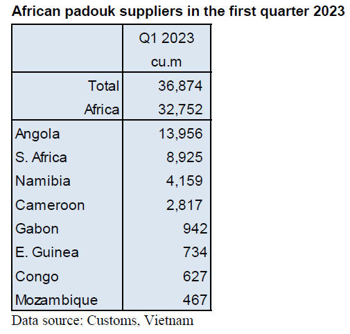Vietnam's imports of padouk from African sources accounted for 89% of total imports of this highly valued timber from all sources in the first 3 months of 2023 reaching 32,800 cu.m, worth US$10.1 million, up 3.5% in volume and 8.2% in value over the same period in 2022.