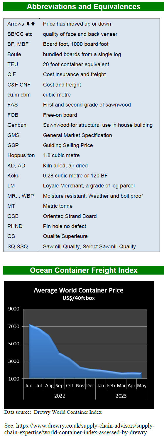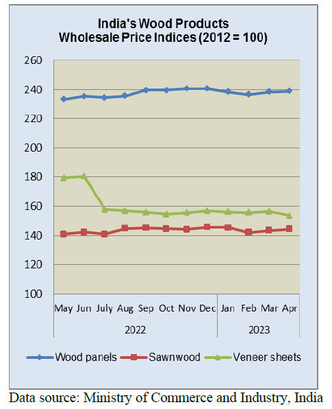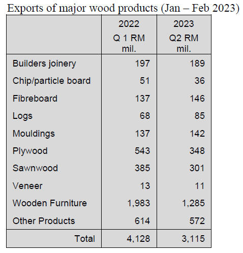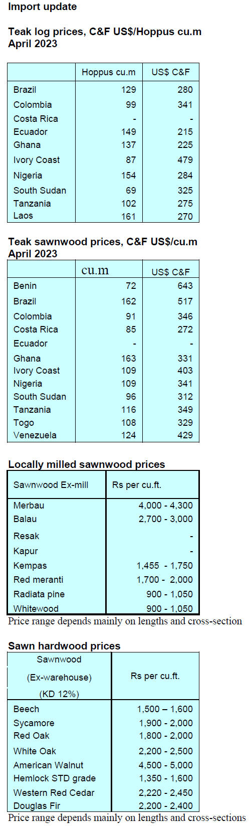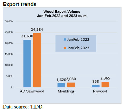 As for tropical plywood, exports declined in volume by 64% and in value by 64%, from 8,400 cu.m and US$4.7 million in April 2022 to 3,000 cu.m and US$1.7 million in April 2023.