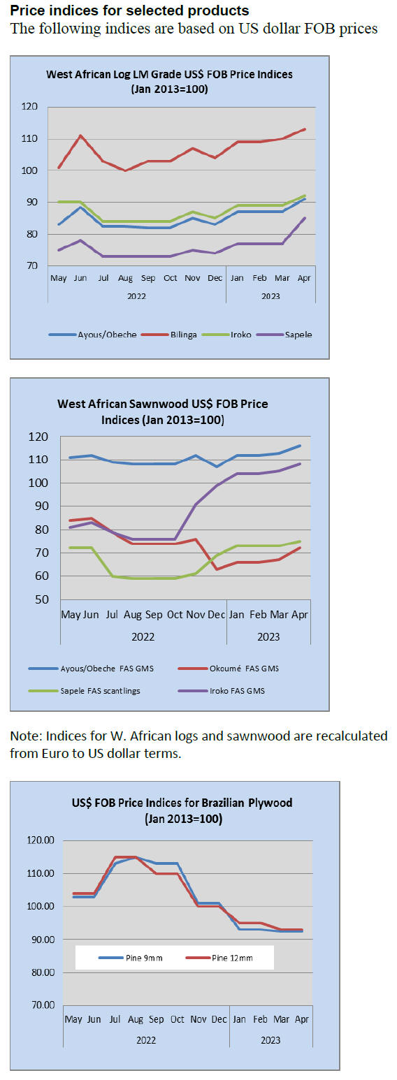Tropical sawnwood exports declined 29% in volume, from 40,900 cu.m in April 2022 to 29,000 cu.m in April 2023. In value, exports declined 17% to US$ 8.7 million from US$15.5 million over the same period.