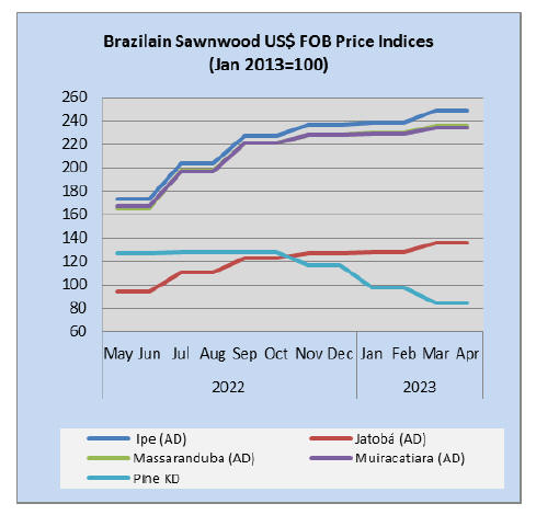 Pine sawnwood exports declined 23% in value between April 2022 (US$77.3 million) and April 2023 (US$59.5 million). In volume, exports declined 6% over the same period, from 281,200 cu.m to 264,000 cu.m.