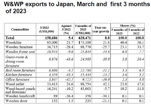 After chips and pellets is wooden furniture. In the first 3 months of 2023 wooden furniture shipped to Japan from Vietnam was valued at US$98.8 million, down 26% year-on-year.