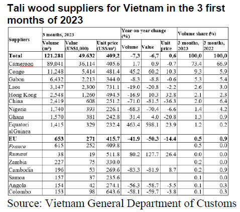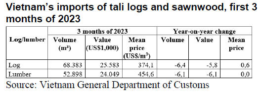 The average price of tali imported into Vietnam in the first 3 months of 2023 reached US$409/cu.m, a slight increase over the same period in 2022. In particular, the price for tali imported from Congo increased by 10% over the same period in 2022 to US$481/cu.m.
