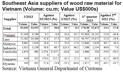 In the first quarter of 2023 imports of wood raw material from Southeast Asia to Vietnam amounted to 95,080 cu.m, worth US$18.55 million, down 14% in volume and down 28% in value over the same period in 2022.