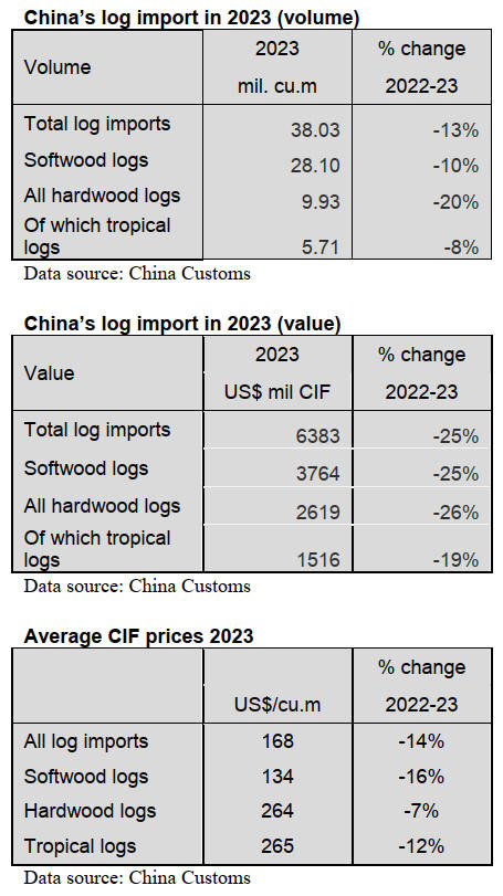 Decline in tropical log imports in 2023