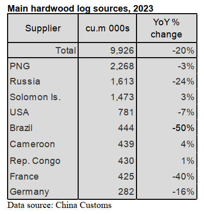 2023. China’s hardwood log imports from PNG fell 3% to