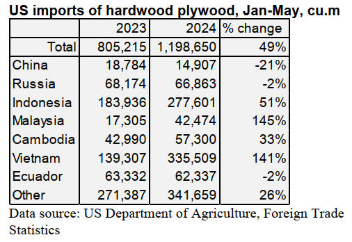 While US imports of hardwood plywood rose by only 1%