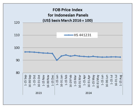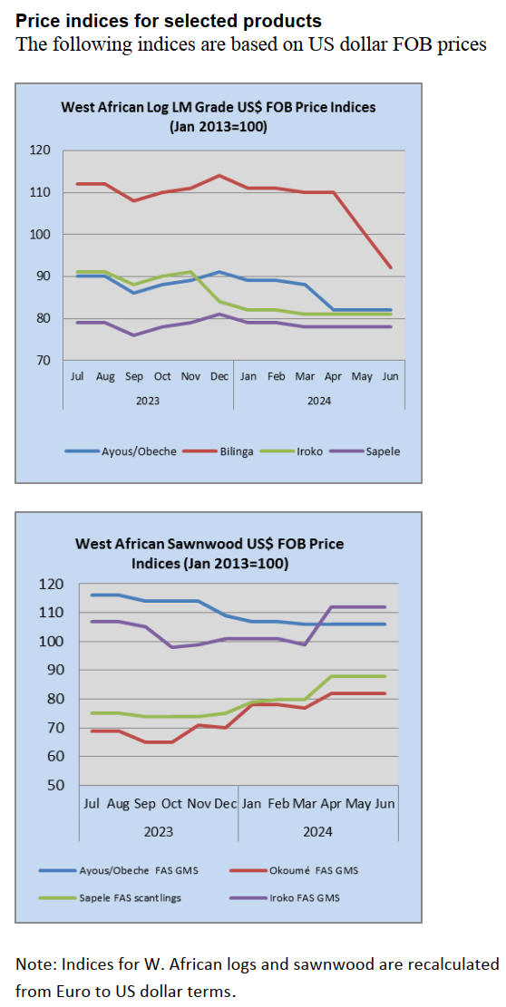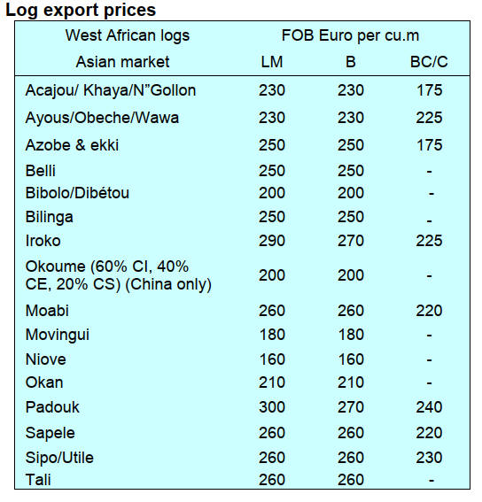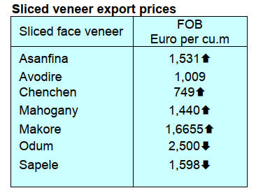 for sawn okoume KD dropping to Eur400 per cubic metre