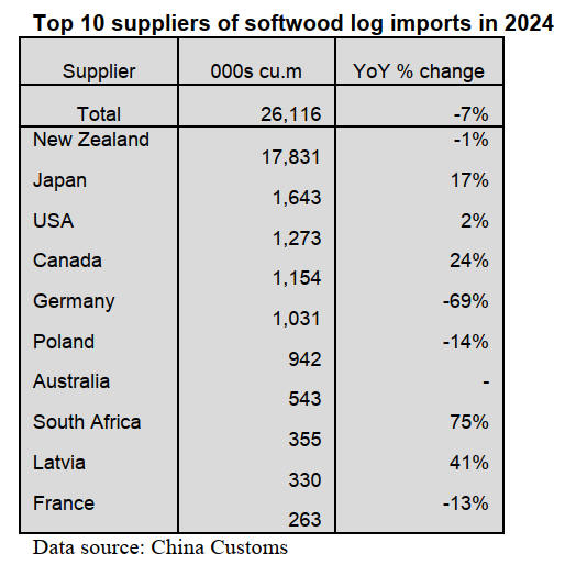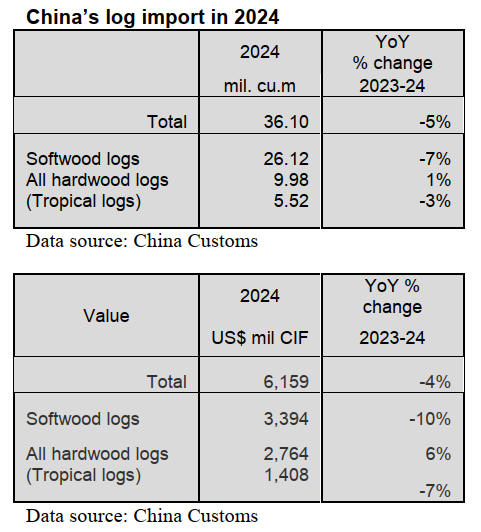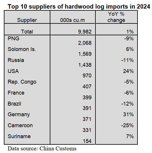 Hardwood log imports in 2024 rose 1% to 9.98 million