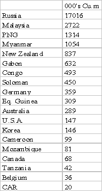 and Sawnwood Supplying Countries According to the latest statistics from China Customs, in 2004 China's timber (including log and sawnwood) imports totaled 32.3 million cubic metres, of which, log imports totaled 26.3 million cubic metres (tropical log imports accounted for 27.6%) and sawnwood imports totaled 6 million cubic metres. In terms of imports, the main log and sawnwood supplying countries are as followings: